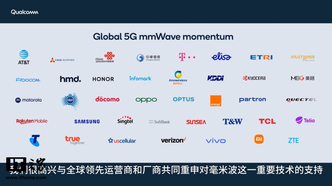 而在 28 日,宣布与高通合作共同推动当今 5G 毫米波发展的全球移动行业领军企业包括 Airtel、AT&T;、中国联通、中华电信、德国电信、爱立信、HMD Global、荣耀、Infomark、京瓷、诺基亚、乐天移动、三星电子、软银、TCL 通讯、vivo、沃达丰、小米和中兴通讯等等。